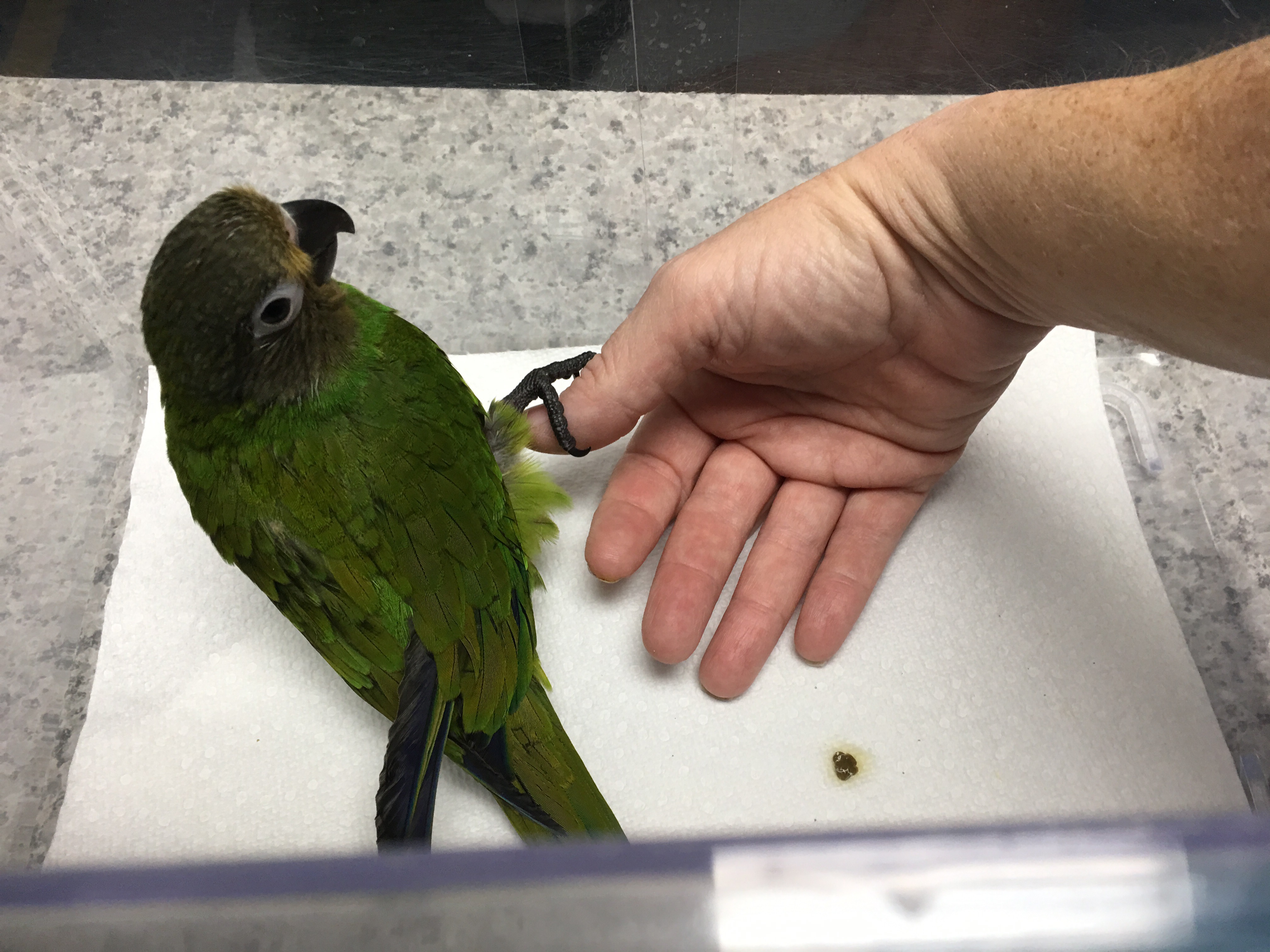Dusty was brought to us after a man in Florida decided he didn’t want the baby birds in his palm tree…so he cut the tree down knowing there were babies in it. Two of the babies died and Dusty was barely alive when found. As you can see he suffered a severe break in his leg and still has fluid around his heart but he’s an amazing, lovable baby.